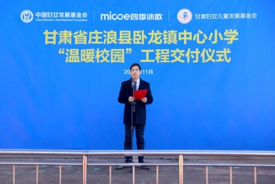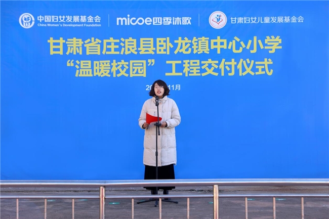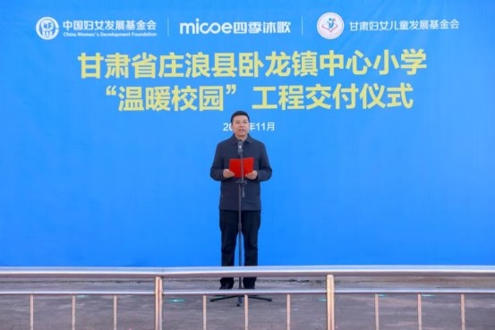 甘肃妇女儿童发展基金会项目负责人何佩燕,庄浪县妇联党组书记、主席张荣,庄浪县教育局党组成员、教育发展中心主任柳清平,卧龙镇党组成员、副镇长薛润润,卧龙镇中心小学校长李军太,四季沐歌集团品牌总监李文平、视频推广部部长刘光超、商用兰州营销中心总经理庞存等领导和企业代表共同出席,学校全体教职工与学生现场见证这一温暖时刻。本次交付仪式由庄浪县妇联党组书记、主席张荣主持。