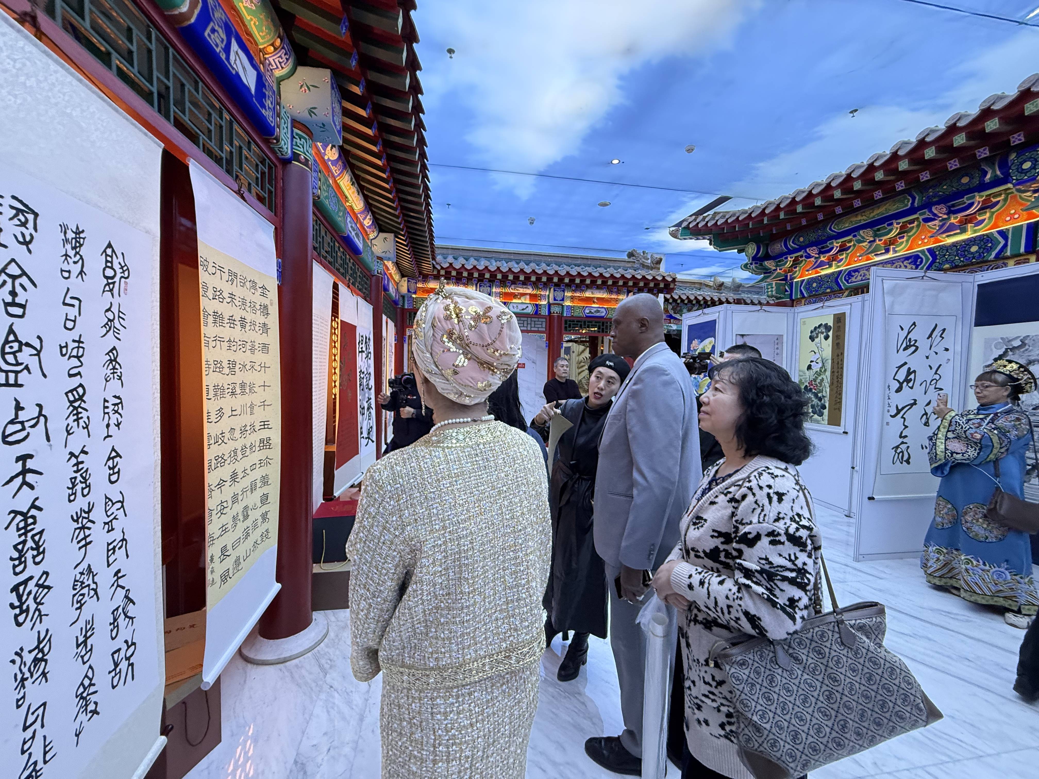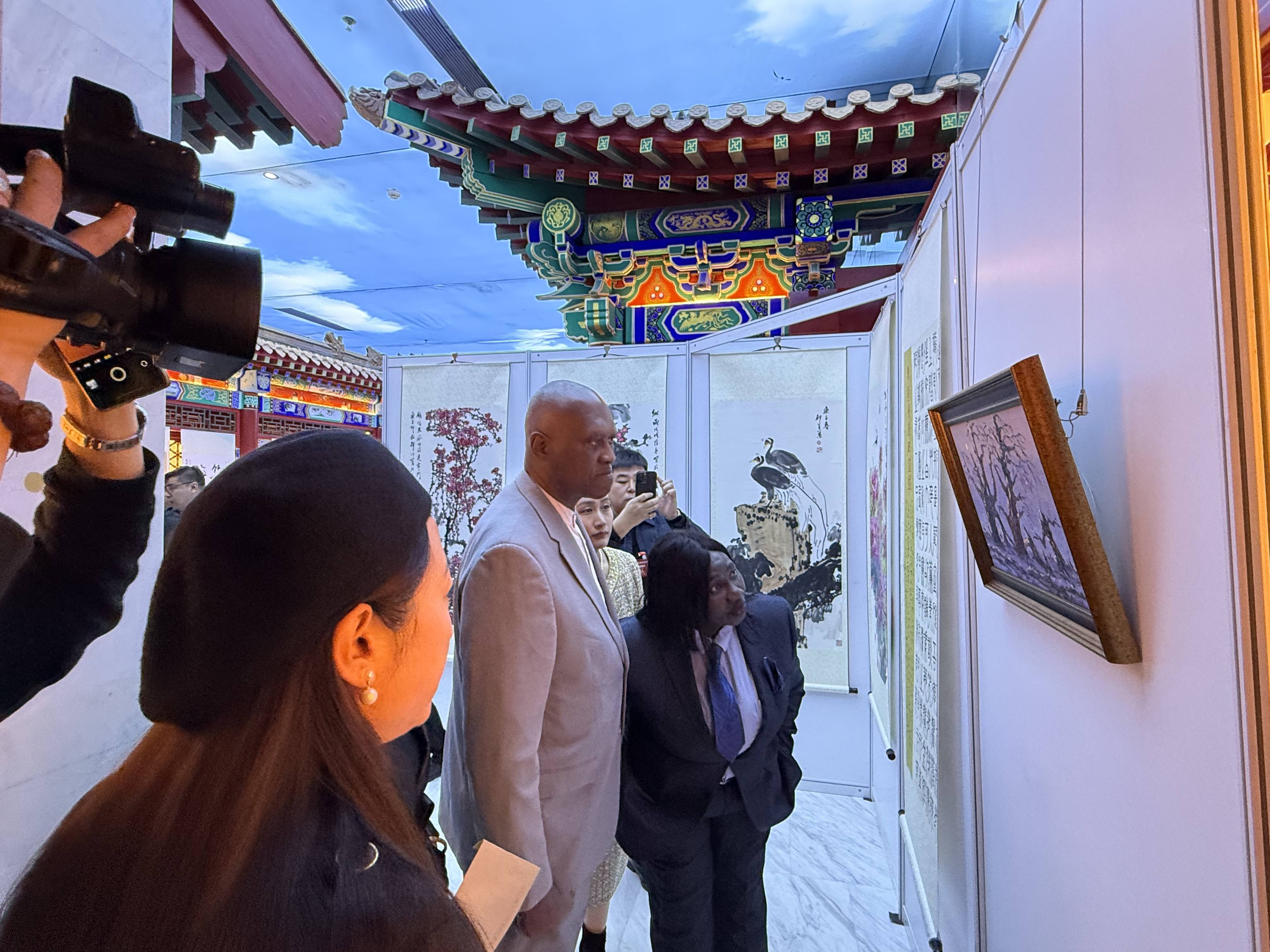 作为世界文化中国代表人物、中国非遗大师、国家级中国茶文化首席非遗中国茶文化研究院院长,罗大友的出席为活动赋予了鲜明的文化标识与专业厚度。活动现场同步举办的书画艺术展中,罗大友与来自全国各地的优秀艺术家共同呈现了兼具东方美学与文化底蕴的精品力作。展会期间,威尔弗里德大使阁下专程前往参观品鉴,罗大友向大使详细解读了中国传统书画艺术的笔墨神韵、茶文化中的人文内涵,以及作品中承载的中非友好愿景,让国际友人深度感受中国文化的独特魅力与深厚底蕴。